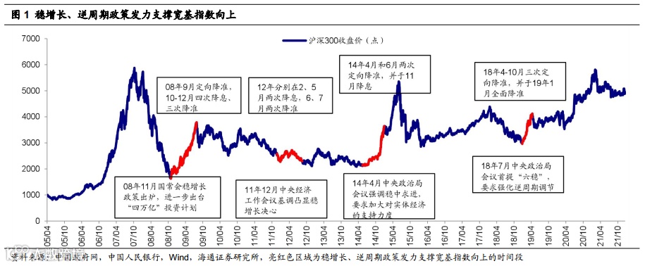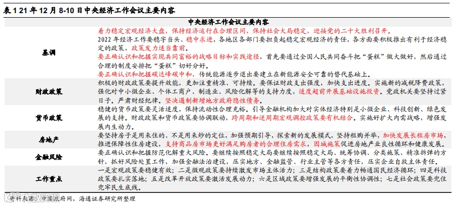 “稳增长”信号明确,后续政策力度有望不断加强。目前经济下行压力加大基本已经成为共识,政策拐点也出现了,但是部分投资者仍然担心后续政策力度不够。12月8日至10日的中央经济工作会议提出我国经济发展面临需求收缩、供给冲击、预期转弱三重压力。经济下行压力加大背景下,“稳”是2021年中央经济工作会议最为突出的关键词,会议新闻稿中出现了25个“稳”字,提出2022年经济工作要“稳字当头”、“稳中求进”。2021年下半年以来宏观政策转向宽松的基调在本次中央经济工作会议得到延续,并且会议重提“逆周期”表述,强调“财政政策和货币政策要协调联动,跨周期和逆周期宏观调控政策要有机结”。在“稳”的大基调下,会议提出各地区各部门要担负起稳定宏观经济的责任,各方面要积极推出有利于经济稳定的政策,政策发力适当靠前。在这样背景下,我们认为货币政策、财政政策和房地产政策均有望放松。货币政策方面,2021年12月20日一年期LPR利率下调5BP,未来还有望进一步放松。财政政策方面,据新华社报道,财政部副部长许宏才12月16日在国务院政策例行吹风会上透露,近期财政部已向各地提前下达了2022年新增专项债务限额1.46万亿元。根据海通宏观团队预测,2022年基建投资增速将达到6%,其中投向广义新基建的比重或提升到18%左右(过去两年均在16%左右)。房地产政策方面,我们预计房地产政策端会渐进式进行调整,减小房地产市场的下行压力。回顾2008年全球金融危机至今,我国先后共推出四轮稳增长的逆周期政策,包括08/11-09/08、11/12-12/12、14/04-15/01、18/12-19/04,在政策宽松的早期,市场还有所犹疑,但是随着更有力的稳增长政策出台、政策效果逐渐显现的时候,市场均有不错的表现。