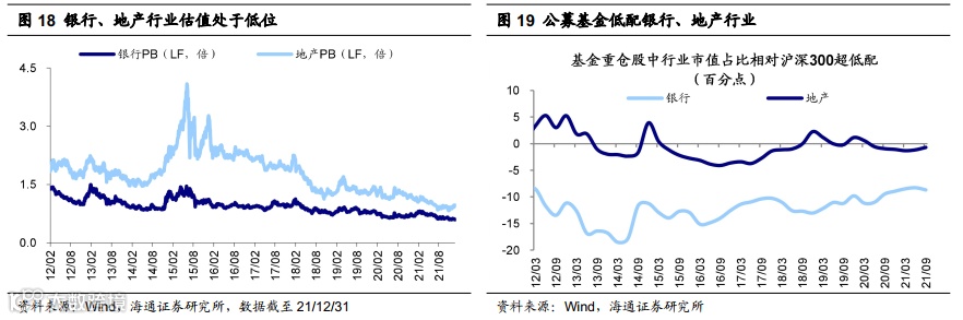 一季度行情均衡配置低估的大金融、高景气的硬科技和跟随反弹的消费。第一,低估的大金融。随着经济下行压力被对冲以及房地产债务担忧消退,大金融行业有望迎来修复。2021年大金融板块涨幅、估值、基金持仓均处在低位。当前(2021/12/31,下同)PB(LF)来看,银行为0.6倍(处0.0%分位)、房地产为1.0倍(处4.4%分位)、证券为1.8倍(处44.5%分位),且在基金配置比例低,21Q3基金重仓股中券商相对沪深300低配5.8个百分点,银行低配8.7个百分点,房地产低配0.7个百分点。我们认为大金融中最值得重视的是券商。2019、2020年券商净利润同比分别为75%、36%,对应券商指数全年最大涨幅为56%、55%,而21年前三季度券商净利润累计同比为24%,申万券商指数21年还下跌了4.2%。此外,当前地产政策面已经出现积极变化,信用风险担忧有望下降,目前房企境内发债政策开始松动,房企合理的资金需求正在得到满足,个人住房贷款也恢复正常,我们认为房地产依旧有望迎来估值修复机会。历史上,春季躁动行情中银行地产出现修复的概率较大。第二,高景气的硬科技。上文我们分析过,新能源车产业链有望维持高景气,但盈利增速有所下滑叠加估值处于历史高位,阶段性消化估值需要等市场环境改变,一季度难以出现。第三,消费跟随式反弹。2021年大消费行业跌幅较大,背后是消费行业基本面的恶化。往后看,消费板块的基本面有望回暖,性价比将改善,但整体看消费板块的机会不会很大。