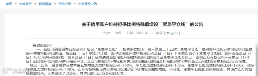 随着市场持续转淡,风险也在逐渐演绎。有投资者收到长城证券短信,内容是:该公司将于2022年1月17日起在原有平仓线相关条款基础上,新增“紧急平仓线”条款,在此提请您特别关注。记者查阅了长城证券的官网,发现的确有这一通知。那么,究竟又是什么情况呢?