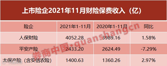 产险业务方面,今年前11个月,人保财险、平安财险和太保财险分别实现原保险保费收入4052.28亿元、2433.20亿元和1400.63亿元,同比增幅分别是1.58%、-7.29%和2.97%。