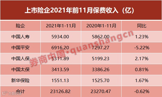 证券时报记者统计发现,2021年前11月,中国人寿、中国人保、中国平安、中国太保和新华保险累计实现原保险保费收入23126.81亿元,同比微降0.62%。