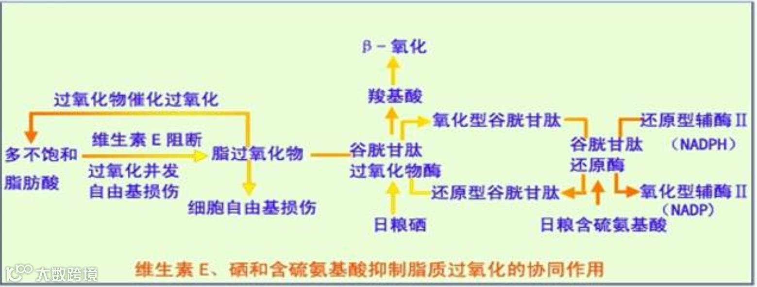 提高动物体本身的抗氧化能力是关键。如使用高吸收率与储存率的奥尔硒等(高温季节200-250g/吨饲料)、维生素E,大幅提高动物机体的抗氧化与抗应激能力。这些物质对机体的抗氧化能力协同作用如下图。
