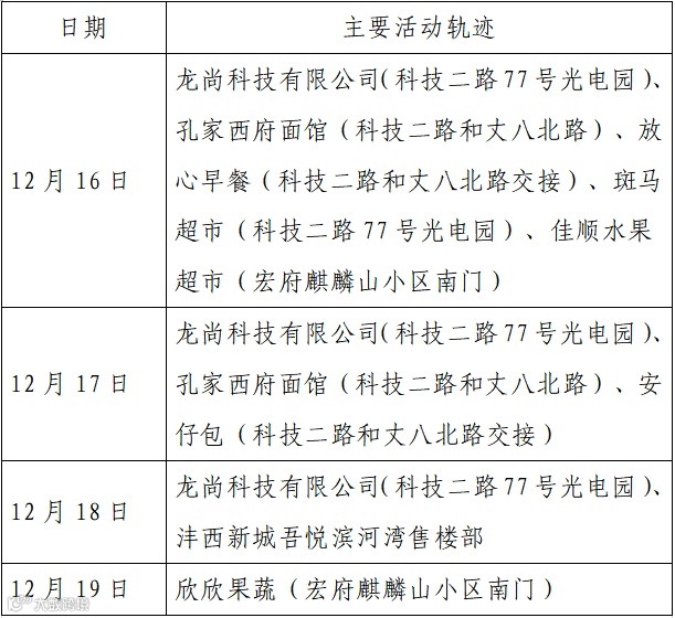确诊病例41,现居西安市高新区。所在工作区域出现确诊病例,12月20日被隔离,12月24日核酸检测结果阳性,轻型。无公共场所活动轨迹。