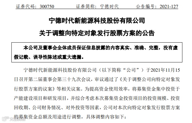 15日晚间宁德时代发布公告,对此前披露定增方案的募集资金总额及用途进行了调整。