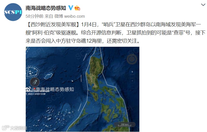 据@南海战略态势感知消息,1月4日,“哨兵”卫星在西沙群岛以南海域发现美海军一艘“阿利·伯克”级驱逐舰。综合开源信息判断,卫星抓拍到的可能是“查菲”号,接下来是否会闯入中方驻守岛礁12海里,还需密切关注。