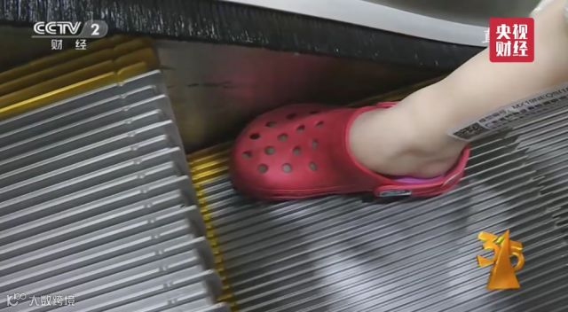 洞洞鞋材质柔软,易变形,小朋友活泼好动,如果乘坐扶梯时脚下动来动去,一不留神就容易卷进去,发生事故。最容易夹脚的地方是在电梯的侧面,也就是梯级和裙板的缝隙,被卷入的风险很大。所以,小朋友在乘坐手扶电梯时,要避免穿洞洞鞋。同时,家长需注意提醒孩子站在梯级的安全区域内,以免发生意外伤害。