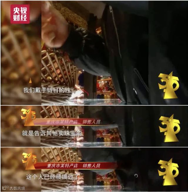 一位特产店的老销售道出了玄机:其实,店里每天都会处心积虑地“安排”几十个顾客抽到一等奖。为骗取顾客的信任,销售人员的临场表演十分到位。更让人大跌眼镜的是,抽奖柜台标价几千到上万元的玉石饰品,在珠宝城的批发价竟只有几十元到一百多元。而那根象征好运的红绳,也是销售人员用来标记被骗顾客的暗号,告诉同行别再下手,避免穿帮!销售人员:“在这些被骗顾客的身上,一天就能挣3万元。”