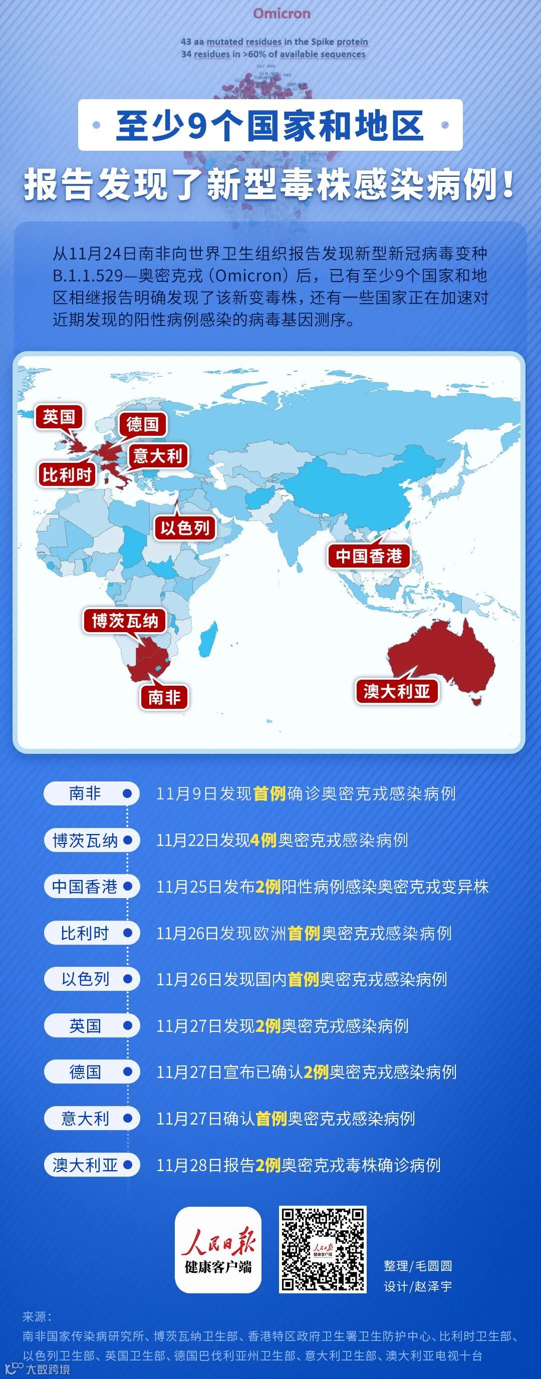 从11月24日南非向世界卫生组织报告发现新型新冠病毒变种B.1.1.529—奥密克戎(Omicron)后,截至目前,5天内已有至少博茨瓦纳、比利时、以色列、英国、德国、意大利、中国香港、澳大利亚等9个国家和地区报告发现了该新型变异毒株。此外,荷兰、捷克也疑似出现了此变异毒株的踪迹,正在做进一步的病毒基因测序。