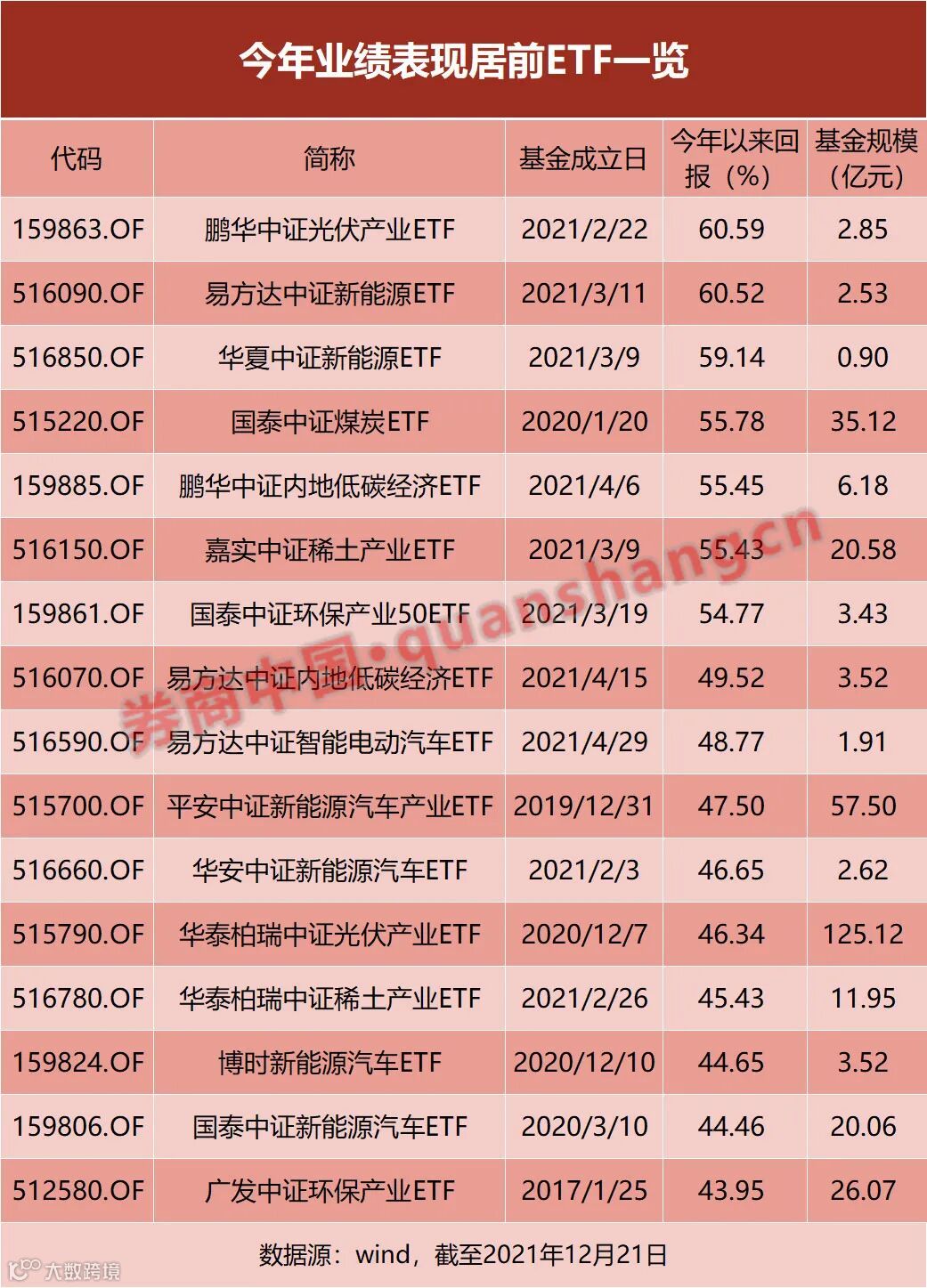 值得注意的是,A股行情分化,ETF年内收益率首尾差距超110个百分点。今年业绩表现居前的ETF有鹏华中证光伏产业ETF、易方达中证新能源ETF,年内回报均超60%,表现最差的是一只教育ETF,年内下跌54.9%。