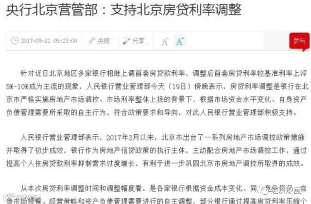 针对近日北京地区多家银行相继上调首套房贷款利率,调整后首套房贷利率较基准利率上浮5%-10%成为主流的现象,人民银行营业管理部今天(19日)傍晚表示,房贷利率调整是银行在北京市严格实施房地产市场调控、市场利率整体上扬的背景下,根据市场资金水平变化、自身资产负债管理需要所采取的自主行为,符合政策要求和导向,对此人民银行营业管理部积极支持。
