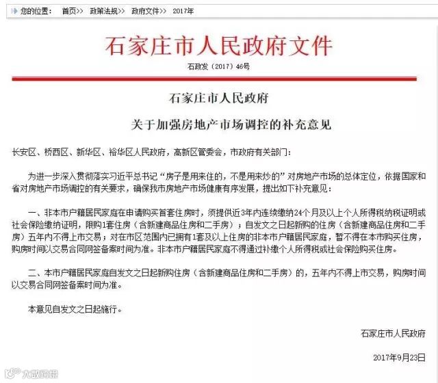 石家庄:石家庄今日发布《加强房地产市场调控的补充意见》,意见指出,非本市户籍居民家庭在申请购买首套住房时,须提供近3年内连续缴纳24个月及以上个人所得税纳税证明或社会保险缴纳证明,限购1套住房,本市户籍居民家庭自发文之日起新购住房(含新建商品住房和二手房)的,五年内不得上市交易。