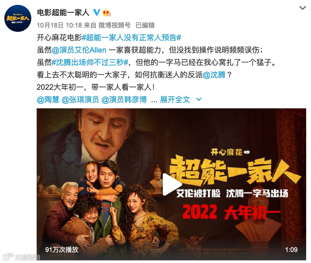 《超能一家人》由开心麻花等出品,主演艾伦、沈腾也都是开心麻花系演员。故事改编自俄罗斯电影《超能力家庭》,一半场景在俄罗斯拍摄,风格依然是荒唐喜剧。受《日不落酒店》等作品的过度营销的影响,目前网友对这部电影的最大担心是“含腾量”究竟几何。