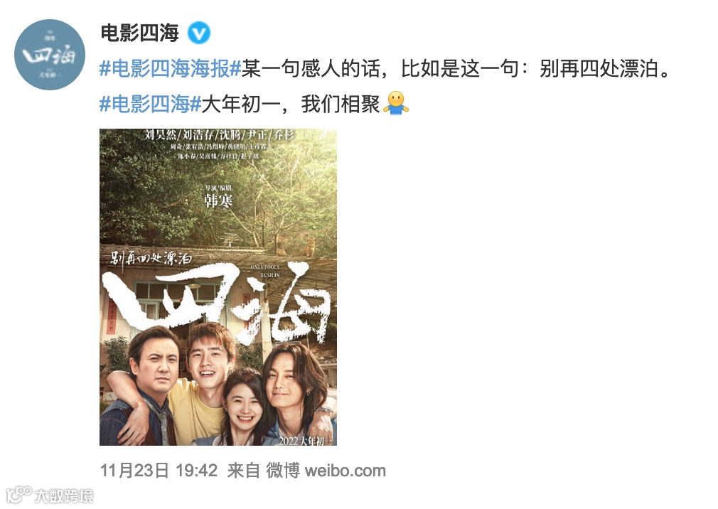 韩寒导演在春节档的历史战绩不俗,《乘风破浪》与《飞驰人生》均为当年春节档票房第三,这次《四海》在豆瓣的想看人数高居第一。不少人预测,只要发挥正常,2022年票房第一梯队肯定有《四海》一席之地。