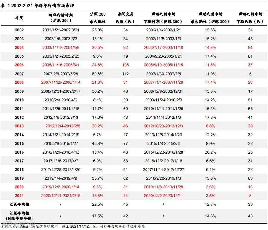 回顾历史,A股跨年行情启动时间与三四季度行情相关。每临近岁末,投资者很关心和期待跨年行情,从历史上看跨年行情是一个相对宽泛的概念,启动也有早有晚,并非简单的始于元旦或者春节。若以沪深300指数为代表来刻画,回顾2002年以来(沪深300历史数据始于2002年)A股岁末年初的行情,均有一定程度的跨年行情,只是启动时间和涨幅会有差异。启动时间早晚往往与上年三四季度行情有关:若三四季度行情较弱,则跨年行情启动偏早且跨年,最早于上年11月中启动,如2004、2006、2008、2013、2020、2021年。若三四季度行情较好,则跨年行情启动较晚,1月中下旬甚至2月初才启动,如2002、2005、2007、2010、2011、2014、2015、2016、2017年。其他年份在元旦附近启动。跨年行情持续时间最长112个交易日、最短仅17个交易日、平均为45天,沪深300涨幅最大89.6%、最小5.7%、平均22.5%。因此从历次岁末年初躁动行情回顾来看,跨年行情每年都有,但启动时间差异大。