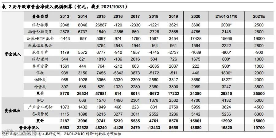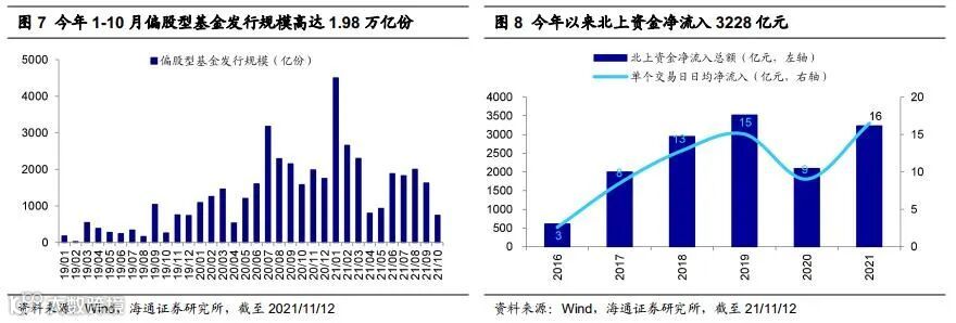 股市微观资金面仍充裕。增量资金入场是支撑市场上涨的重要动力,我们在资金入市框架中分析过,微观资金面可以从流入流出两个方向进行分项汇总计算,具体见表3。通过对上述各项资金面数据进行汇总后,我们测算今年1-10月接近1.7万亿元增量资金入场,而2020年1-10月为1.44万亿元,2020年全年为1.86万亿元。具体来看,偏股型基金发行方面,尽管10月发行规模只有740亿份,但年初至今偏股型公募基金新发规模高达1.98万亿份,而去年同期为1.72万亿份,整体基金的存量规模依旧在上升;再看外资,年初至今北上资金已经净流入3228亿元,日均流入量高达16亿元。综合以上,我们认为今年股市微观资金面仍然充裕,预计今年全年净流入有望达1.97万亿元。