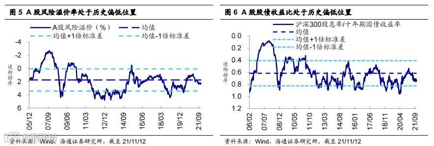 估值尚可,资金充裕。市场看好跨年行情的基础是目前A股估值处于历史中等水平附近,估值整体尚可。截止2021/11/12,全部A股PE(TTM,整体法)为19.4倍,对应13年以来从低到高的分位数为58%,沪深300为13.1倍、61%。全部A股PB(LF,整体法)为2.0倍,对应13年以来从低到高的分位数为68%,沪深300为1.5倍、64%。除了PE、PB外,我们还通过股债收益比、风险溢价率来衡量市场的相对估值水平。从股债收益比(沪深300股息率/十年期国债收益率)看,截止2021/11/12,A股股债收益比为0.73,对应13年以来由高到低的分位数为47%,股市性价比明显优于债市。从风险溢价率(1/全部A股PE-十年期国债收益率)看,截至2021/11/12,A股风险溢价率为2.2%,对应13年以来由高到低的分位数为51%。