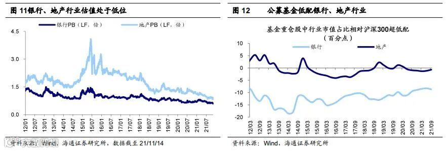 低估的大金融。随着经济下行压力被对冲以及房地产债务担忧消退,大金融行业有望迎来修复。年初至今大金融板块涨幅、估值、基金持仓均处在低位。当前(2021/11/12,下同)PE(TTM,整体法)来看,银行为6.2倍(处13年初以来24.6%分位)、房地产为7.8倍(处4.0%分位)、证券为19.9倍(处17.9%分位);PB(LF,整体法)来看,银行为0.62倍(处13年初以来0.3%分位)、房地产为1.47倍(处0.8%分位)、证券为1.68倍(处33.8%分位)。同时大金融基金配置比例低,21Q3基金重仓股中券商相对沪深300低配5.8个百分点,银行低配8.7个百分点,房地产低配0.7个百分点。当前地产政策面已经出现积极变化,信用风险担忧有望下降。9月24日央行首提两个“维护”之后地产政策开始松动,10月15日以来国家层面召开4次房企座谈会,同时房企境内发债政策开始松动,房企合理的资金需求正在得到满足,个人住房贷款也恢复正常,我们认为房地产依旧有望迎来估值修复机会。历史上,四季度银行地产出现修复的概率较大。大金融中,我们认为最值得重视的是券商,今年前三季度券商净利润累计同比为24%,申万券商指数年初至今(截至2021/11/12)还下跌了7.8%。11月15日北交所将正式开市,未来市场活跃度和流动性有望提升,这将为券商业务带来新的增长点。