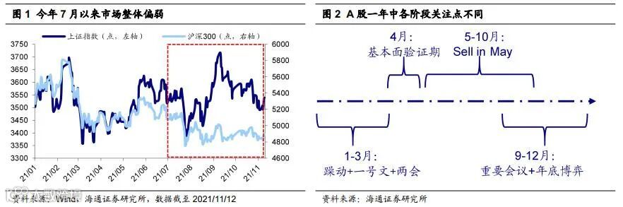 今年7月以来市场整体偏弱,借鉴历史跨年行情有望较早展开。为何A股会有春季行情这一特征?《荀玉根讲策略:少即是多》一书中分析过A股的日历效应,具体而言:从政策周期来看,岁末年初往往是重大会议召开时间窗:每年10-11月召开中共中央全会、12 月召开中央经济工作会议和中央政治局会议,次年1-2月地方召开“两会”、国家多部委召开年度工作会议,3 月召开全国“两会”,相比而言,5-10 月份是政策淡季,对股市刺激较少。从股票市场来看,11月到3月A股处于业绩空窗期,基本面数据披露少,三季报已经披露完毕,年报和一季报还有一段时间。同时,年初资金利率通常有所回落,开年投资者的风险偏好相对更高。今年7月以来(截至2021/11/12)市场整体偏弱、宽基指数处窄幅震荡之中,期间上证综指下跌1.4%,沪深300指数下跌6.5%。借鉴历史经验,今年跨年行情有望提前在11月启动,本次春季躁动背后的逻辑下文将进行详细分析。