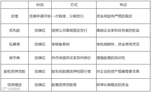 综上,挂牌企业的六种融资方式各有特点,分析员认为挂牌企业要视自身的实际情况选择合适的融资方式。