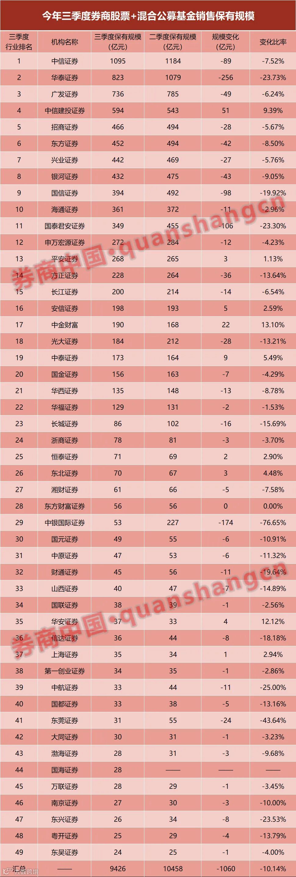 从相对数据上来看,券商三季度整体低迷,多家券商规模大幅度下滑。其中,华泰证券减少了256亿元,国泰君安减少了106亿元,中银国际证券更是从227亿元减少到53亿元,几乎减少了77%。即便是行业龙头中信证券,3季度股票+混合公募基金保有规模也减少了89亿元。