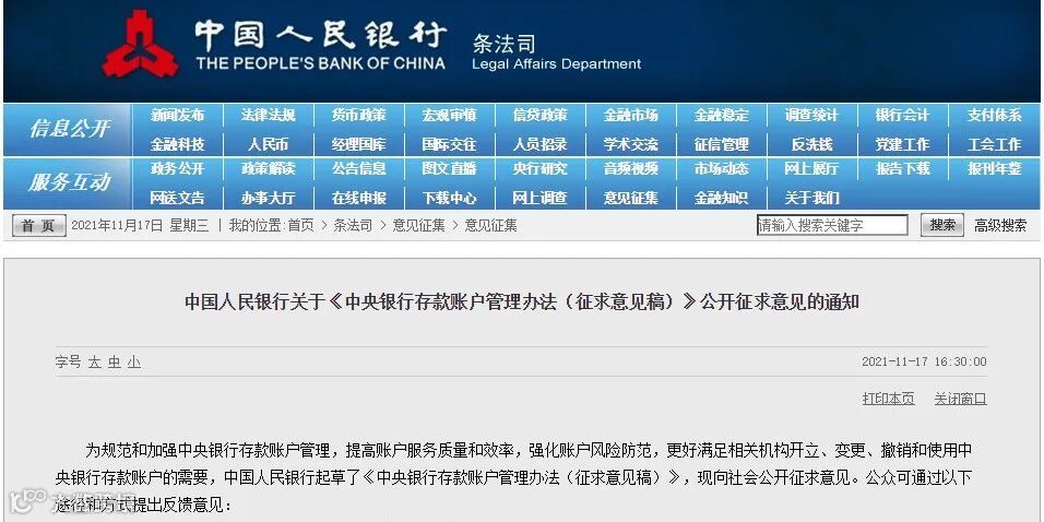 11月17日,为进一步完善中央银行存款账户管理和服务制度体系,使得相关工作有法可依、有章可循,更好地实现人民银行政策目标和履行中央银行账户服务职能,中国人民银行起草了《中央银行存款账户管理办法(征求意见稿)》。