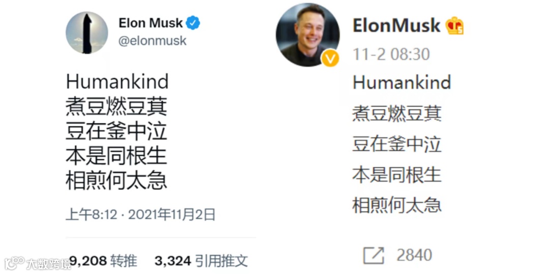 据纵相新闻,11月2日,特斯拉公司首席执行官埃隆·马斯克(Elon Musk)在其社交媒体上发布了这首脍炙人口的中文诗,并附上了一句英文,名为“人类”(Humankind)。网友普遍猜测,马斯克口中的“Humankind”是在反讽此前其被“逼捐”一事。也有网友认为,这首七步诗是在暗指其关注许久的数字货币市场。