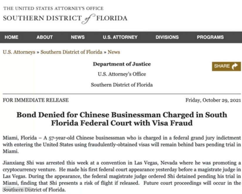 美国司法部官网的一份声明中披露了施建祥被捕的更多细节,上周,施建祥在拉斯维加斯举行的一次有关加密货币投资的会议活动上被捕。10月28日,施建祥首次在美国联邦法院出庭,联邦治安法官认为他有逃跑的可能,下令将其逮捕拘留,将继续在迈阿密监狱等待审判。