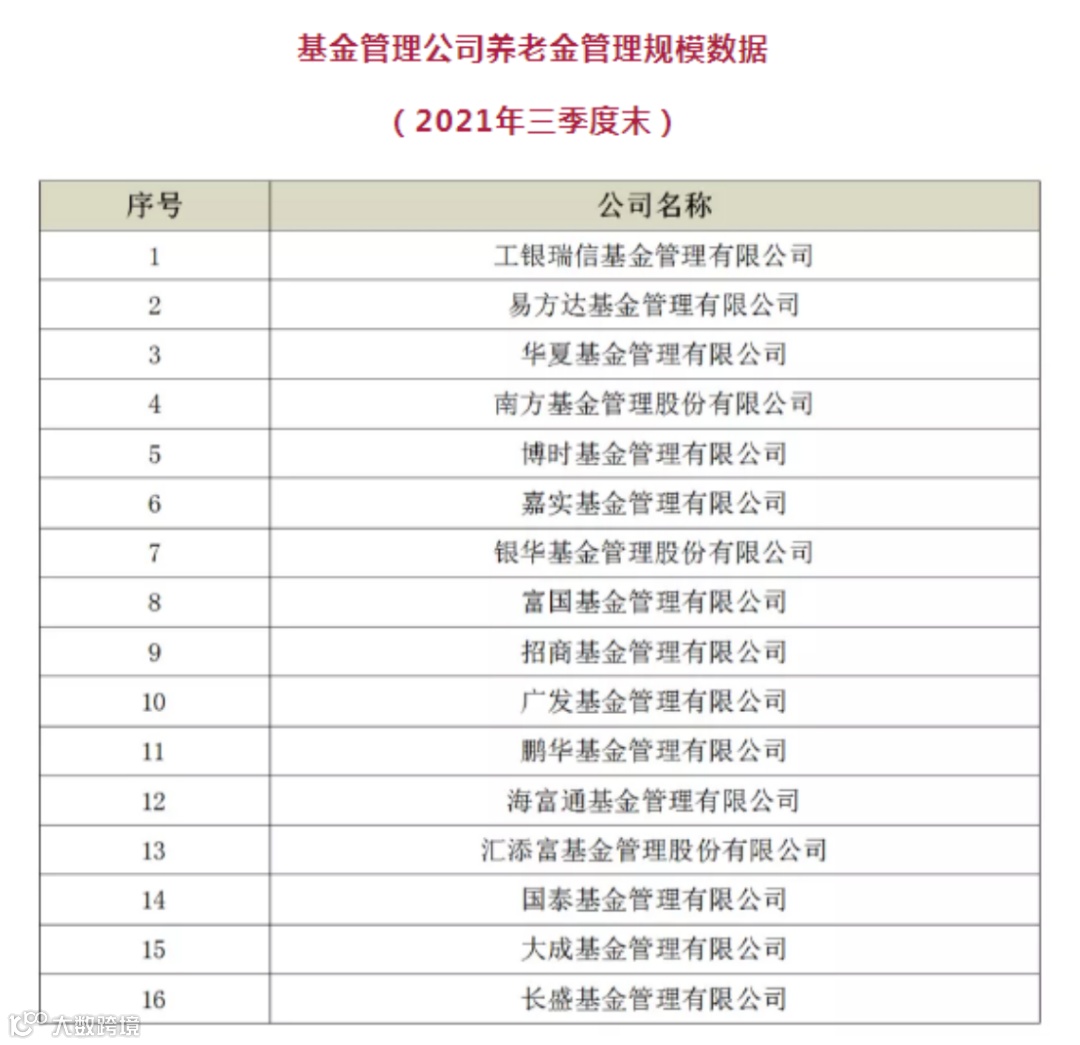 基金业协会数据显示,第三季度公募养老金规模排名前五的分别是工银瑞信、易方达、华夏、南方、博时基金。