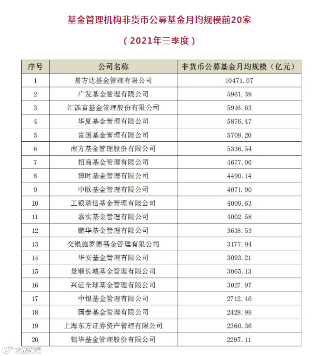 根据基金业协会最新数据,三季度易方达基金非货月均规模再次得到夯实,较二季度增加了469亿元至10471.07亿元,遥遥领先于其他同业公司。