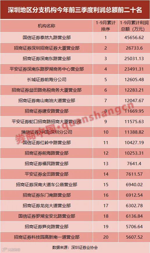 平安证券深圳深南东路罗湖商务中心营业部、长城证券前海分公司、招商证券益田路免税商务大厦营业部、招商证券南山南油大道营业部、招商证券建安路营业部、平安证券蛇口招商路招商大厦营业部、瑞信证券(中国)深圳分公司、国信证券红岭中路营业部、招商证券前海路营业部的前三季度利润总额规模均有亿元以上。
