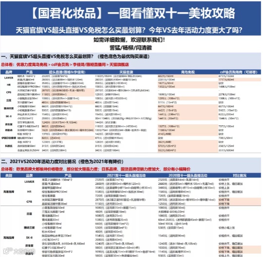 除了上述的各种促销活动外,此前,有大型券商纺织与服装团队制作了一份名为《化妆品双十一全渠道比价指南》的图表,让剁手党们可以一目了然。