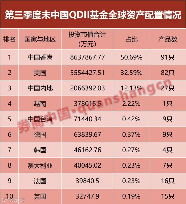截至第三季度末,QDII基金对全球35个地区与国家进行布局,共涉及33个国家。