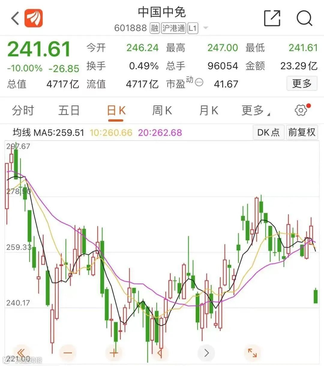行情数据显示,中国中免开盘便大跌8.28%。其后很快就触及跌停。半日市值蒸发超500亿元,总市值告别5000亿关口。截至收盘,报241.61元,目前为市值为4717亿。