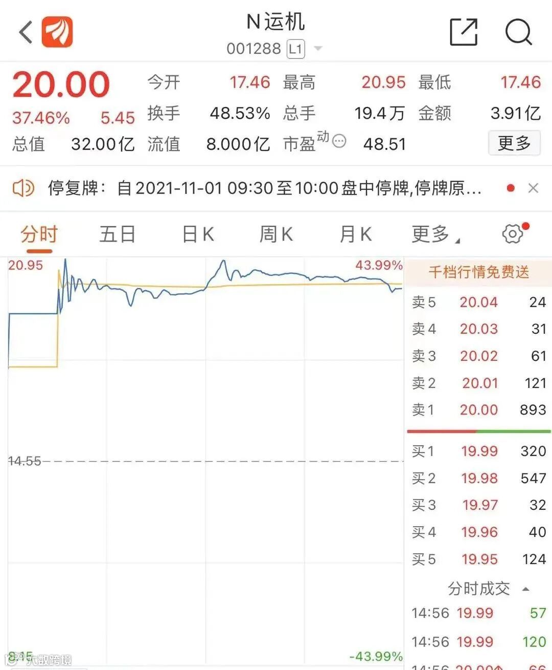 今天上市的两只新股中,运机集团(001288.SZ)上午盘中一度大幅上涨超过40%,股价一度达到20.95元,该股发行价为14.55元。截至收盘,涨37.46%,报收20.00元。