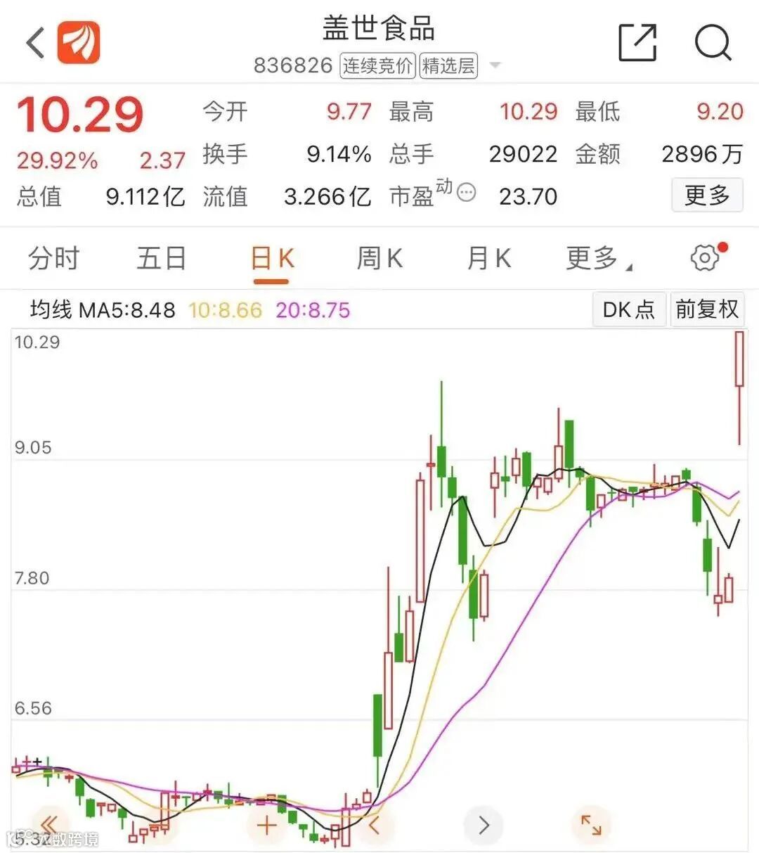 此外,新三板精选层个股也普遍上涨。其中盖世食品涨停,涨幅29.92%,市值逼近10亿元。