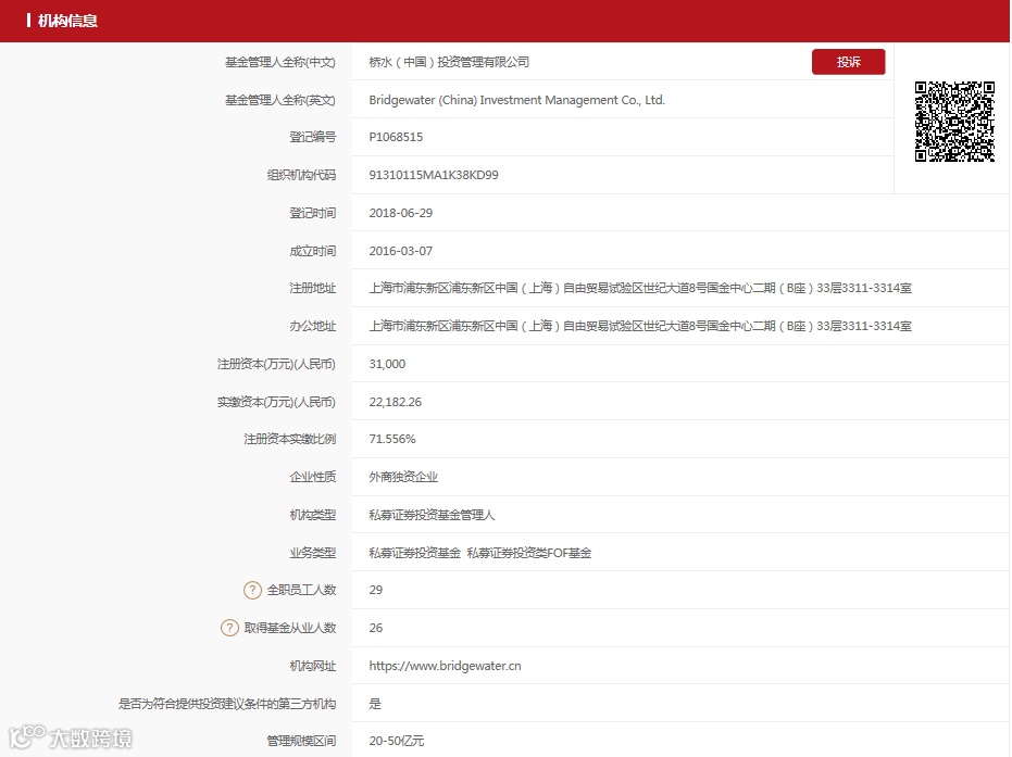 根据中国基金业协会信息,桥水中国成立于2016年3月7日,2018年6月29日在基金业协会登记成为私募证券投资基金管理人,注册地址和办公地址都位于上海浦东新区,全职员工29人。目前管理规模区间为20-50亿元。