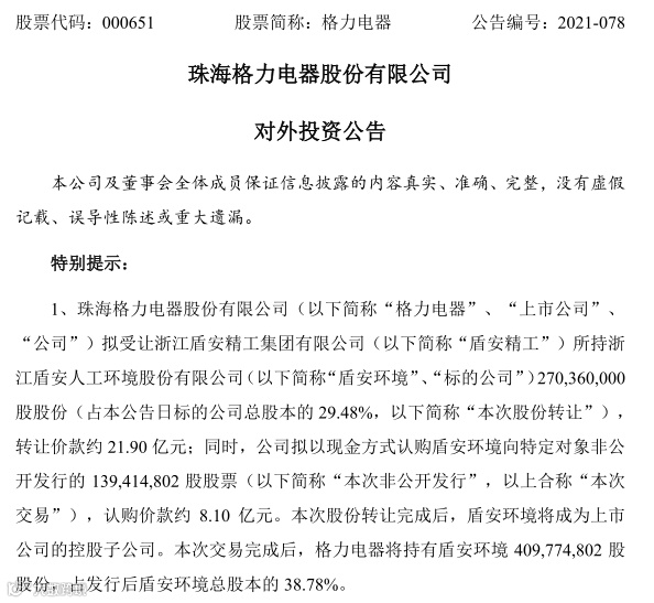 “在此背景下,格力电器为保障核心零部件自主可控,完善产业链布局,拟受让盾安环境29.48%股权并成为其控股股东;同时,格力电器通过认购盾安环境非公开发行股份的方式,进一步提高公司空调上游核心零部件的竞争力和供应链的稳定性。”格力电器表示。