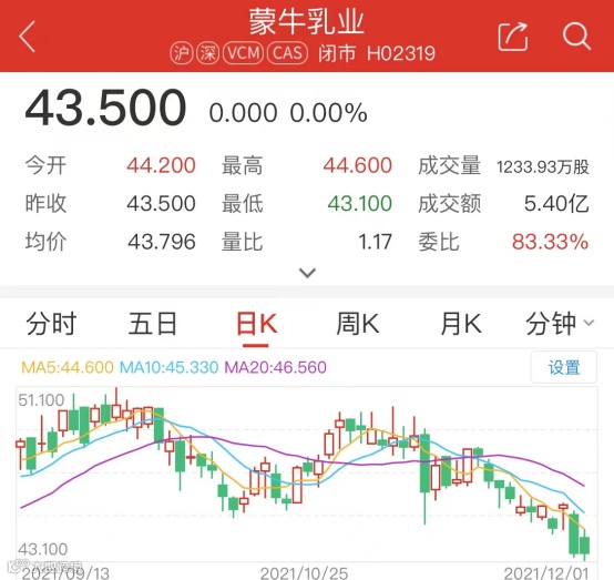 11月30日至12月1日,蒙牛乳业股票画出两条阴线,股价收报43.5港元,市值1720亿港元。