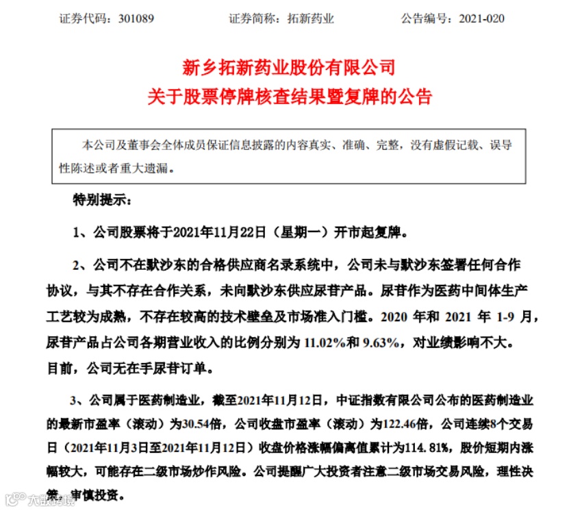 在停牌一周后,拓新药业于11月19日晚间披露了股票停牌核查结果暨复牌公告,公司股票将于11月22日开市起复牌。
