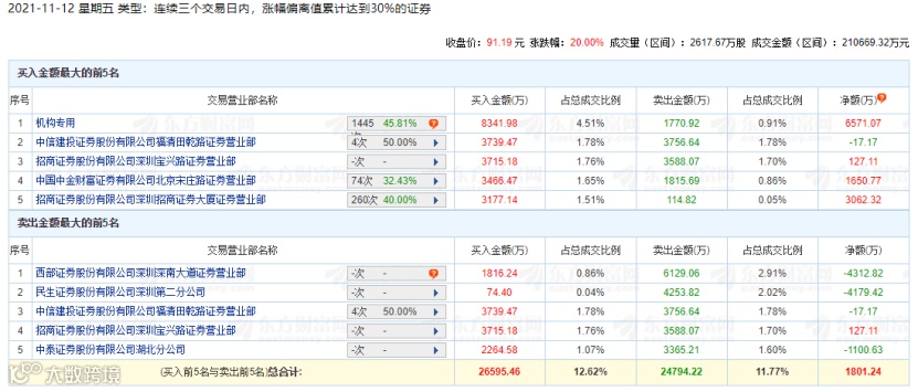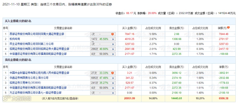 11月10日盘后,拓新药业披露的数据显示,近三个交易日(11月8日、9日、10日),西部证券深圳深南大道营业部买入7847万元;一机构专用席位买入4010万元,同时卖出1309万元;民生证券深圳第二分公司买入3208万元;招商证券深圳招商证券大厦营业部买入2841万元,同时卖出424万元。