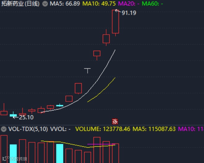 但是,在成功的蹭上默沙东“新冠特效药”这个大热点后,拓新药业的股价彻底被点燃,短短6个交易日的时间涨了186%,期间录得5个20cm涨停。凭借犀利的涨势,拓新药业在资本市场上名声大噪,并获得了“新冠神药妖股”的称号。