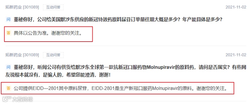 其实,10月底以来,就不断有投资者在互动平台上向拓新药业提问,“听闻公司有供货给默沙东全球第一款抗新冠口服药物Molnupiravir的原料药,请问是否属实?”对此,拓新药业当时的回答是:“公司的尿苷通过贸易商出口”,“公司提供EIDD-2801的原料尿苷,EIDD-2801是生产新冠口服药Molnupiravir的原料”。而对于投资者询问的“公司与默沙东新冠新药有什么联系 ”这一问题,拓新药业仅回答,“具体以公告为准。”