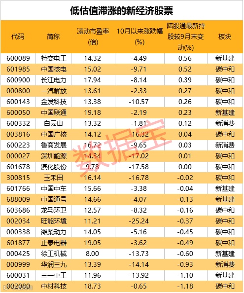 在“新常态”下,企业盈利预期也面临下调压力。返乡潮提前到来只是特殊时期的“产物”,并不能与经济走势完全挂钩。十四五规划之下,上述四大亮点也将成为重点发展方向。数据宝梳理了与碳中和、新基建、新消费相关的概念股中,估值低于20倍,且10月以来跑输上证指数的股票,共计22只,碳中和13只,新消费3只,新基建6只。10月以来跌幅超15%的有旺能环境、滨化股份、中国广核等,北上资金10月以来加仓居前的有特变电工、中国核电、长江电力等,其中特变电工同时兼具碳中和、新基建概念,公司是变压器行业龙头,世界领先的新能源系统集成商。