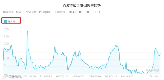 近期,百度搜索指数显示,“返乡潮”热度大幅上升,指数值几乎要与2020年、2021年春节前后持平。返乡潮一般都出现在春运期间,距离春节还有近2个半月的时间,难道返乡潮是提前到来了吗?