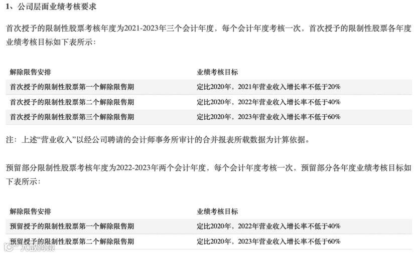 虽然“20%、40%、60%”三个数看起来不错,但是如果仔细看就会发现,2022年和2023年的业绩基准都是2020年,也就是说,公司考核的最终业绩指标是3年增长60%,年化增长率不及20%。