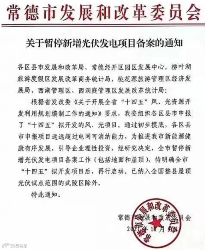 随后,有常德市发改委人士向媒体证实:“情况属实,目前我们正在进行新能源规划,《通知》是考虑到电网消纳等做出的相关举措。”