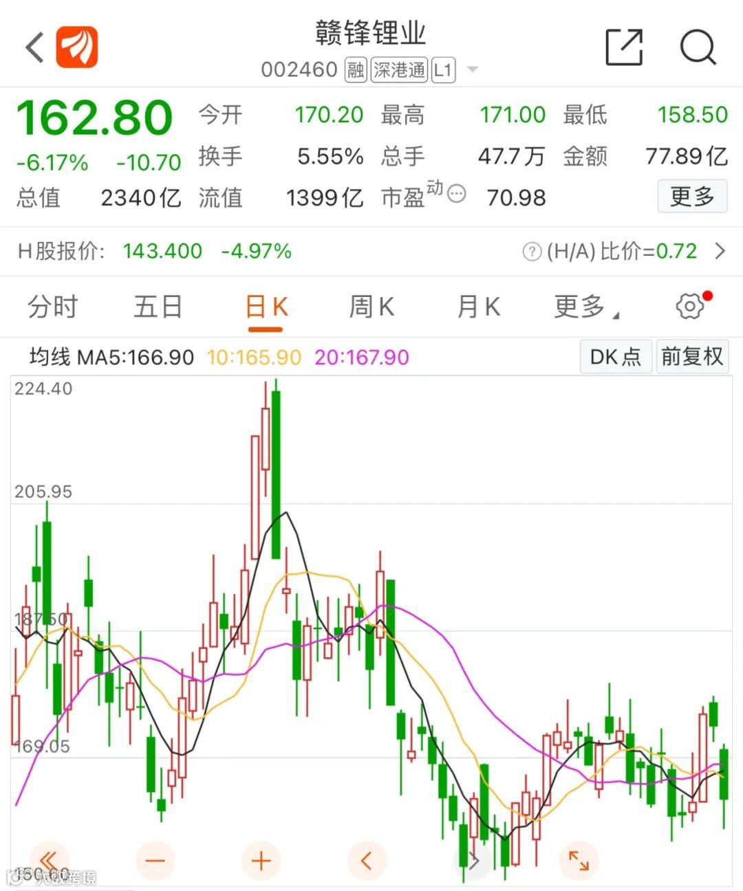 其中,最滚烫的新能源赛道全线下挫。总市值超2100亿的赣锋锂业(002460)盘中一度暴跌超过8%;恩捷股份、天齐锂业盘中一度大跌超6%,午后均有所回升;比亚迪A股盘中下跌超过4%,比亚迪H股盘中一度跌逾5%;宁德时代也未能独善其身,盘中一度跌超4%,截至收盘,跌幅仍达2.3%;截至收盘,锂矿指数跌超4.8%,盐湖提锂指数跌超4%,动力电池指数跌2.3%