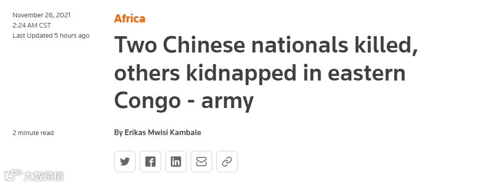 路透社称,刚果(金)军方发言人25日证实了上述消息,当地一名负责人和民间组织人士也证实“两名中国人死亡”,并称“有8名中国人失踪”。报道称,事发地点位于伊图里省朱古地区,当地军方发言人称,我们确认是“刚果民主联盟”(CODECO)武装分子所为。