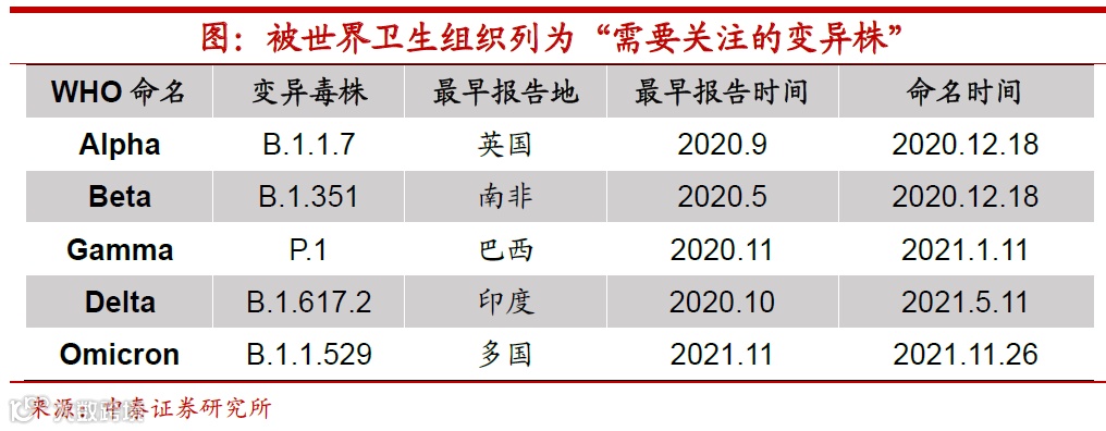 Omicron得到史上最快命名。世界卫生组织将新冠病毒变异株标记为三个层次:一是“需要担忧的变异毒株(VOC)”,对这类毒株的响应级别最高;二是“需要关注的变异毒株(VOI)”;三是“需要监测的变异毒株(VUM)”。Omicron是目前最快被列入VOC名单的变异毒株,从最早报告到列入VOC名单不足一个月。根据BNO News所做的统计,截止目前,全球共有13个国家或地区发现了由Omicron变异毒株引发的新冠确诊或疑似病例,其中以南非病例最为集中。尽管这一变异毒株在11月刚刚被发现,但其已经很快成为了南非的优势毒株。理论上,Omicron变异毒株的传播力很可能要远远强于目前的其它变异毒株。不过,事实上,目前人们对于这一变异毒株的了解相对较少,传染性和逃避免疫能力还未有定论,尚有赖于进一步观察。