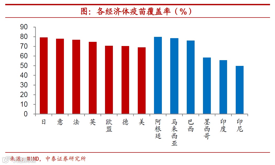 如果疫情扩散,经济有何影响?谈及Omicron变异毒株出现对经济的影响,无非是下列三种情形之一:一是仅仅“虚惊一场”,那么全球经济几乎不受影响,资本市场情的冲击也会很快修复;二是变异毒株传染性和毒性超出预期,现有免疫手段完全失效。这相当于新冠疫情重来一遍,全球政策环境重回宽松,这对于资本市场可能会是利好,不过,该情形出现的概率很小;三是Omicron变异毒株引发的疫情严重程度介于前两种情形之间,类似于Delta变异毒株产生的影响,这种情形具备一定的出现概率,后文的分析也是立足于此。从当前的情况来看,全球各经济体疫苗覆盖率水平已然较高,全球疫情严重程度可能低于上一轮,并且发达经济体所受干扰较小,疫情可能仍主要集中在发展中经济体。